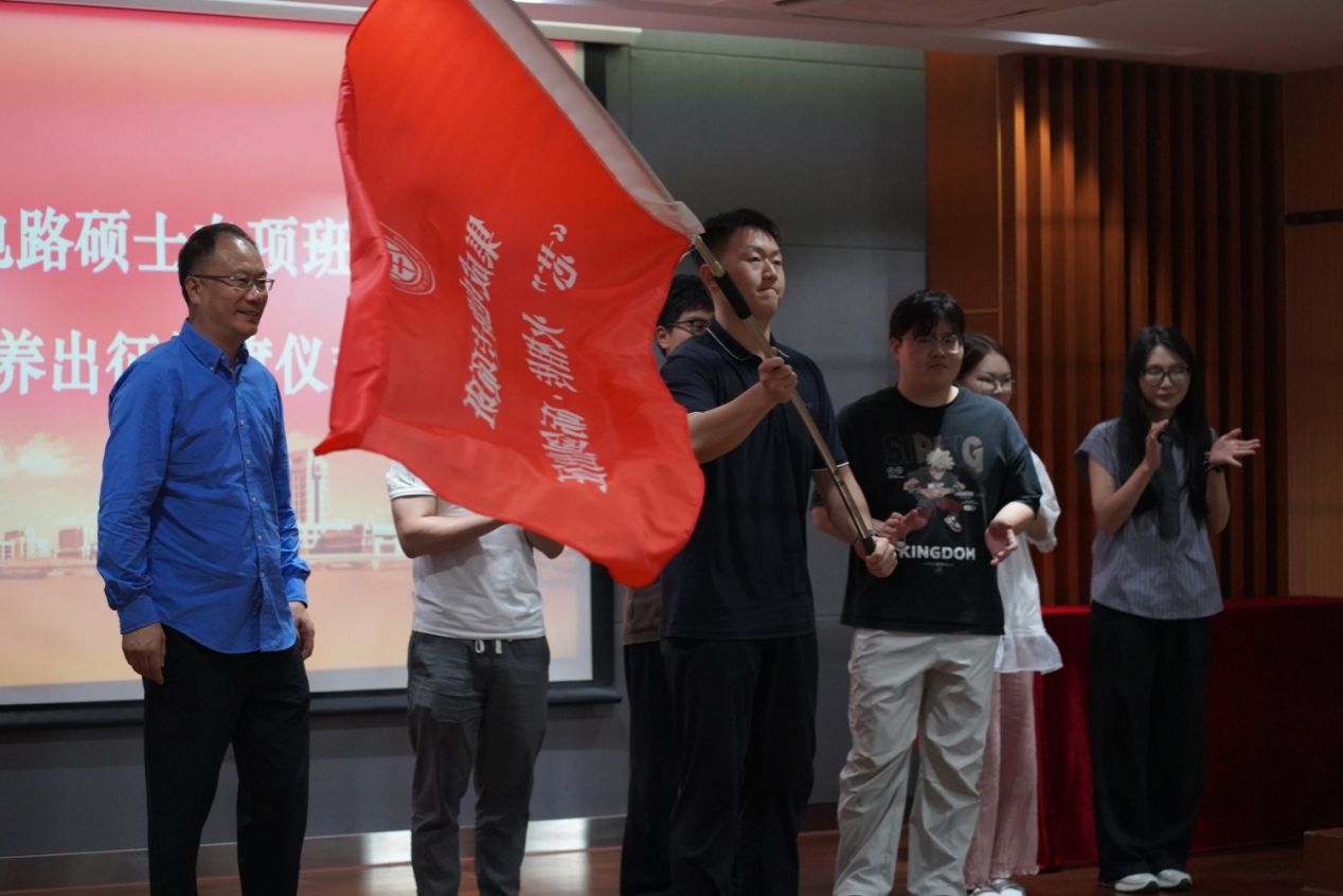 最后,副校长毛祥东教授为集成电路专项班学员代表授旗,并宣布出征。这面旗帜代表着校企合作的责任与使命,也代表着同学们的勇气与决心。希望同学们在实践过程中,发扬不怕困难、勇于拼搏的精神,虚心向企业导师学习,努力提升自己的专业技能和综合素质。出征仪式在热烈的掌声中圆满结束!