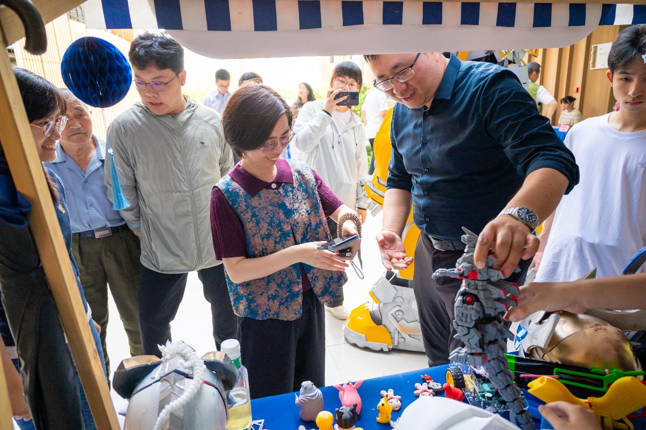 在活动现场,上海应用技术大学智能技术学部的大学生科技创新作品展位前人流如织。形态各异、功能多样的3D打印产品有序陈列,涵盖了创意工艺品、实用小物件等多个品类。同学们对3D打印技术原理、产品特色及应用场景作了充分介绍,罗兰萍对同学们的创新实践成果给予了高度评价。