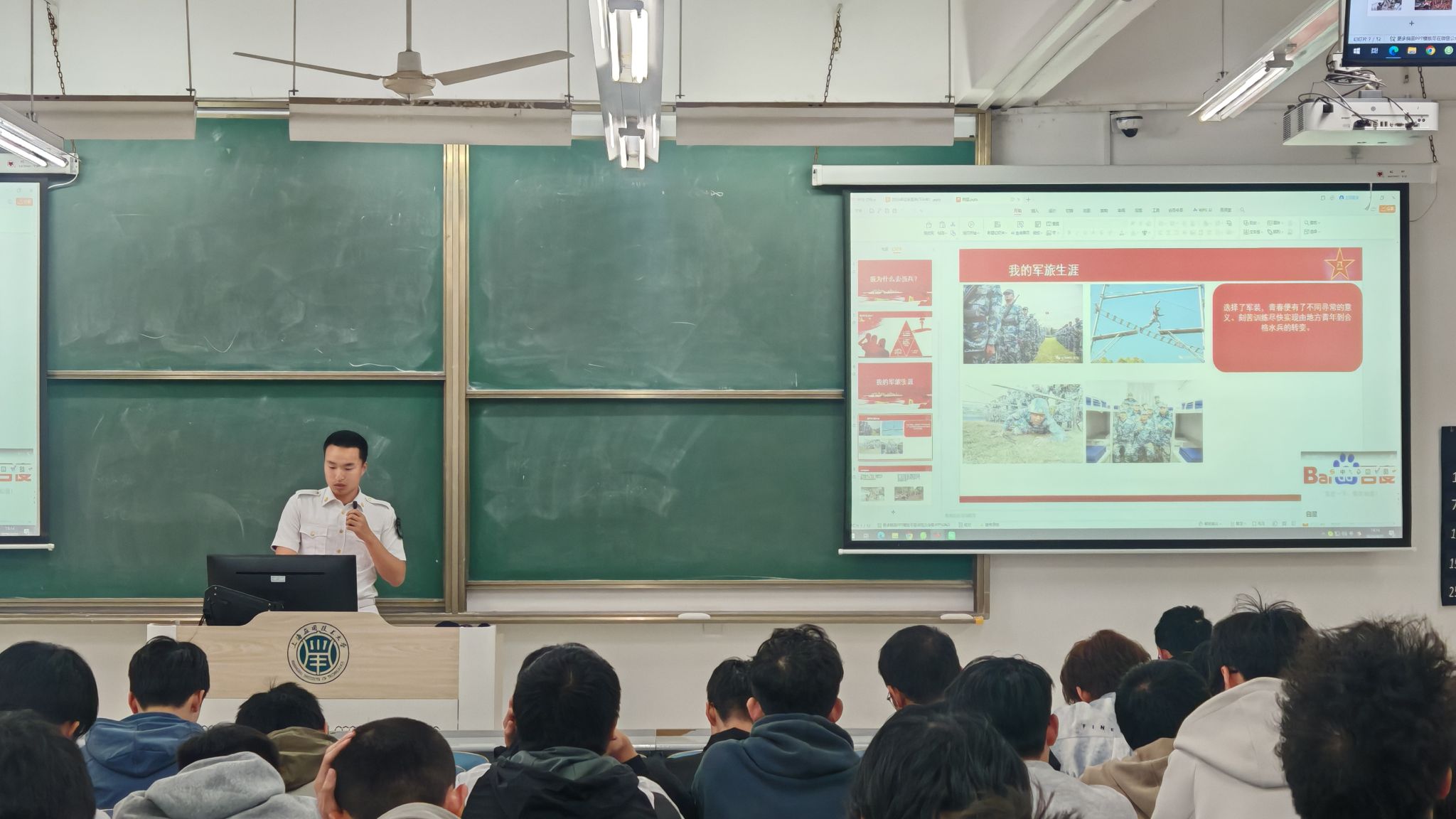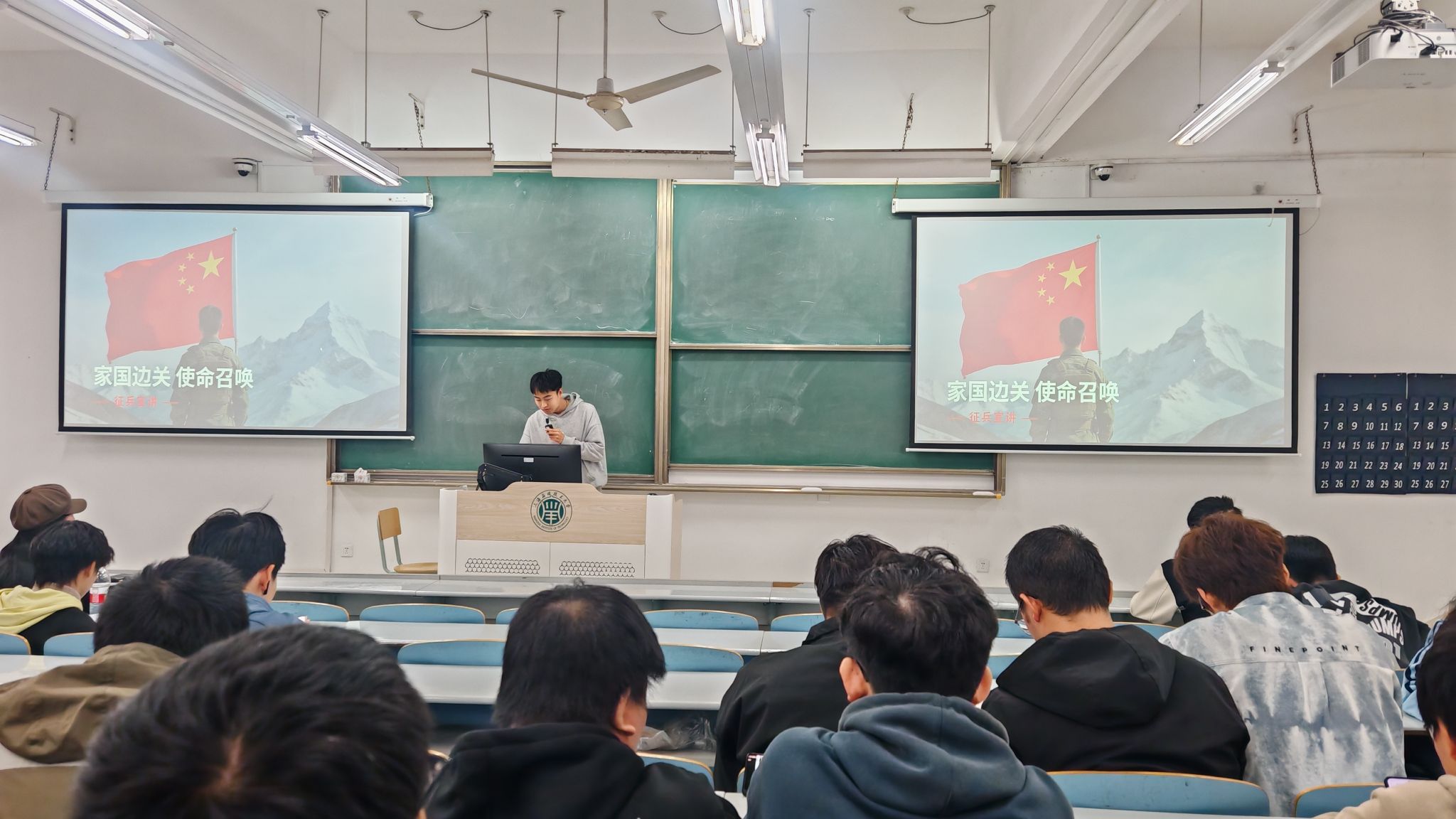 宣讲会上,陈翔老师围绕“政策名目、优待政策、报名准备”三个板块展开系统讲解。他结合国家现行征兵政策,详细介绍了大学生入伍的学业保障、经济补助、升学政策及退役就业扶持等具体内容。通过大量真实案例与数据,生动展现了近年来在校大学生参军入伍的突出表现与成长轨迹,帮助同学们全面了解“为什么要入伍、入伍能获得什么、如何顺利入伍”。