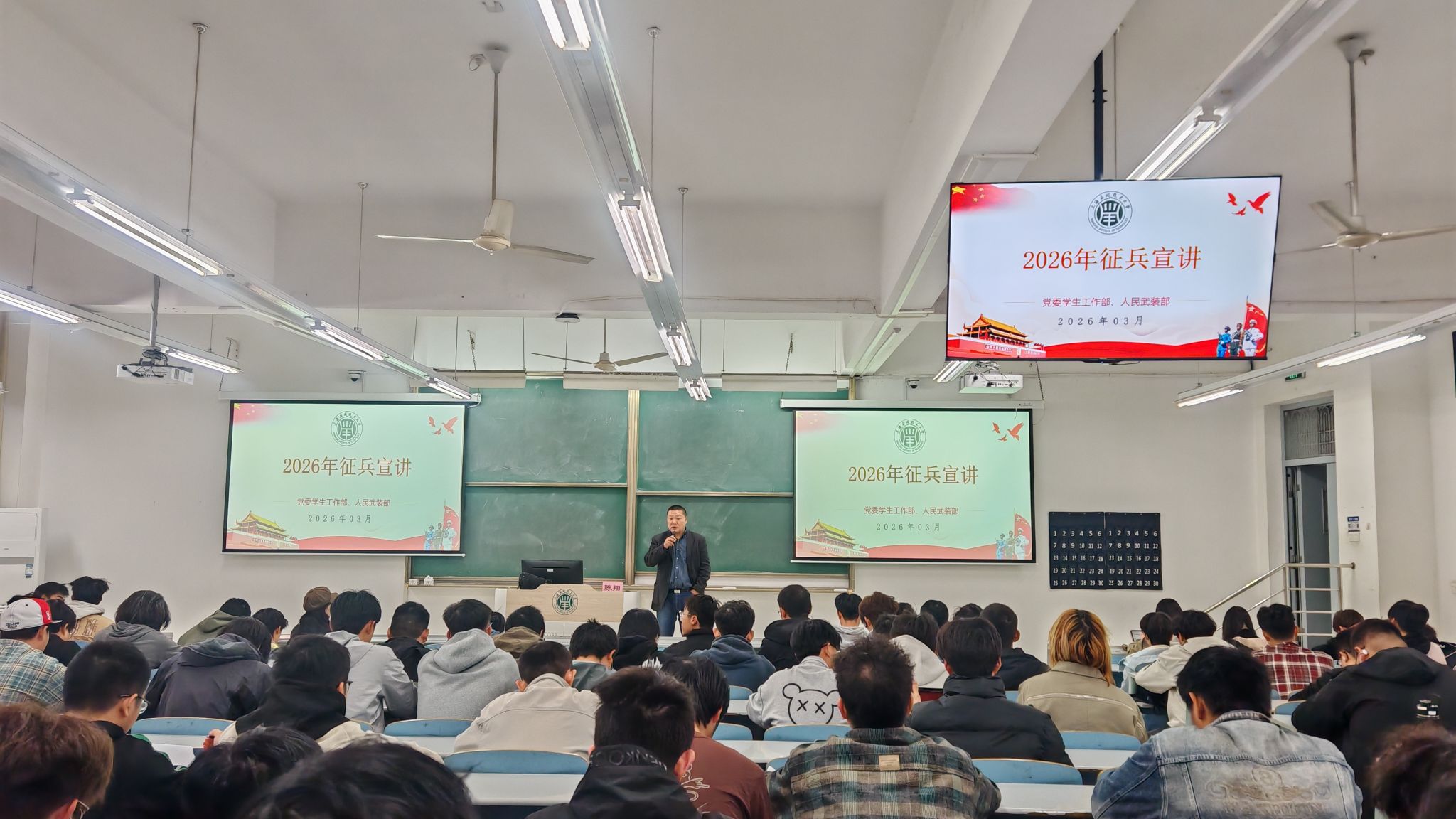 为强化国防观念,点燃军营梦想,4月21日,智能技术学部召开2026年下半年征兵宣讲会。校党委学生工作部、人民武装部副部长陈翔及校征兵宣讲团宣讲,学部辅导员郑慧主持,200余名上应学子到场参会。