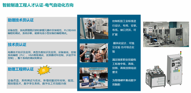 西门子智能制造工程人才认证体系,以其独特的教学理念与实践经验,为我国智能制造与数字化转型的人才培养提供了系统化的解决方案。该认证计划涵盖电气自动化、机电数字化、工业互联网、数控数字化等四大方向,并设置了四个认证评定等级,既适应了现代工业的技术需求,也满足了各类院校的教学实际。