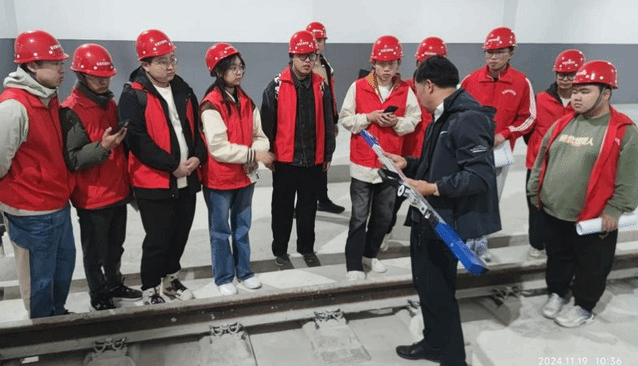 据悉,上海市域铁路调度、运营和技能培训基地(以下简称“三中心”)是申通地铁为提高上海市域铁路网络运营管理水平,保障上海市域铁路网络运营调度和职工技能培训、实现上海市域铁路网络互联互通打造的综合性基地。审核评估期间,我院铁道工程系师生正在“三中心”实习基地进行2021级本科《工务实习》的现场认知和轨道检测实习。市域铁路公司、中国铁路上海局、中铁二十四局相关专家为同学们现场深入讲解了高速铁路道岔的相关知识,并指导学生进行道岔构件形位测量。同学们利用宝贵的现场实习机会,回顾了理论知识的同时大大提升了现场测量作业的技能本领。与此同时,通过与企业工程师和技术人员的交流沟通也丰富了求职经验。已入职市域铁路运营公司的我院2024届毕业生蒋欣宇、王长易也同师生们进行了亲切友好的交流,并协助指导老师组织学生进行了道尺、支距尺等测量技能小组考核。