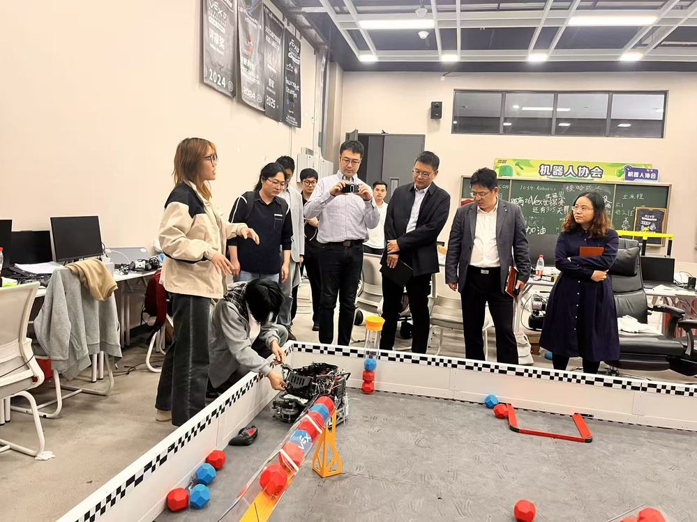 走进深圳技术大学中德制造学院,调研组重点参观了工业机器人实验室、机器人驱动与控制实验室、机器人工程实验室。座谈交流环节,双方聚焦智能制造专业教育改革深入交流。深技大“以产业需求倒推课程设置”“校企双导师共带项目”等经验,与学部智能制造专业建设方向高度契合,双方计划联合探索课程优化、科研攻关合作,助力提升智能制造人才培养适配性。该学院借鉴德国“双元制”教育模式,与德国多所高校及本土智能制造企业开展深度合作,整合机械、自动化、机器人等相关专业资源,打造跨学科协同育人平台;通过“企业调研-课程重构-实践强化”的闭环机制,每年组织教师深入企业调研产业需求,及时调整课程内容,确保人才培养与企业需求无缝对接。此外,积极拓展校外实训基地,各专业均与对应行业重点企业建立了持续十年以上的合作关系。