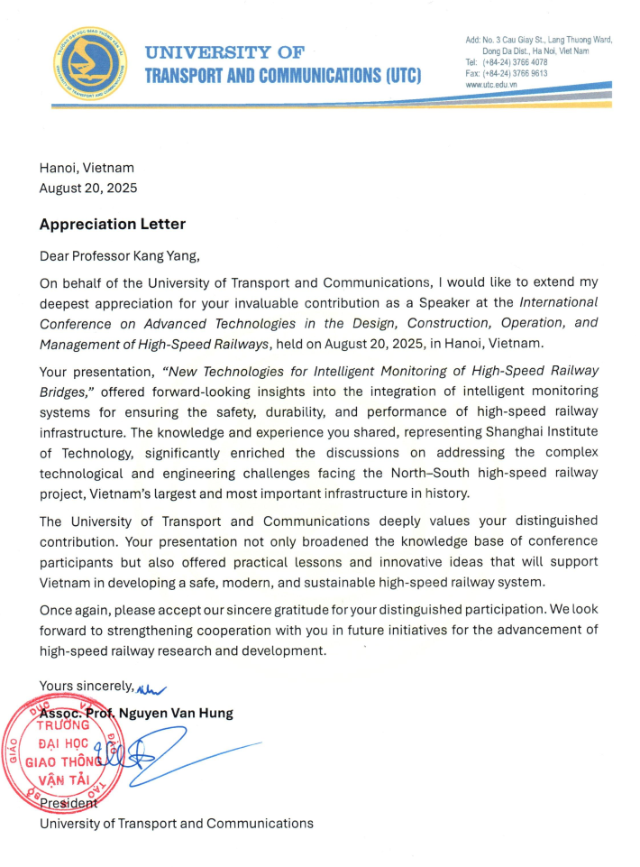 会后,河内交通大学土木工程学院通过感谢信,对杨康老师的学术分享表示高度认可与感谢。