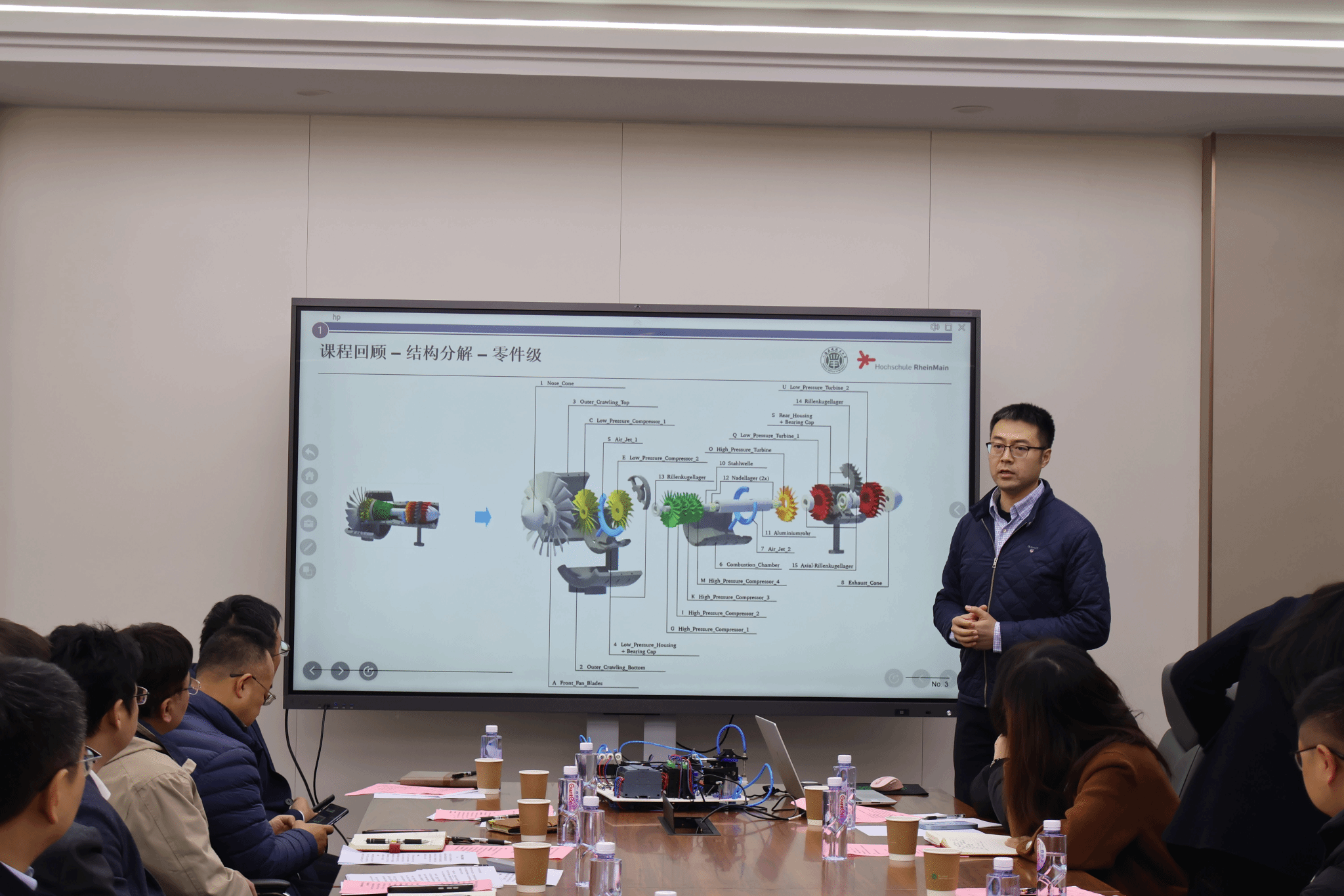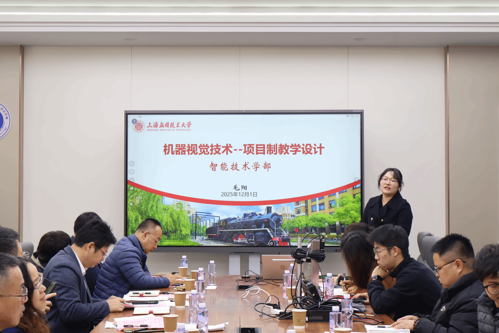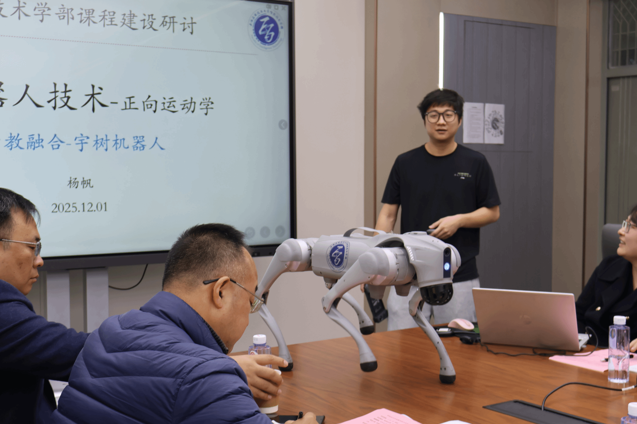 随后,各课程负责人围绕产教融合、项目式教学、AI+赋能三大试点类型,汇报重点课程改革进展。宗鸣、李颖针对《智能技术基础》AI+赋能课程,分享了运用AI工具优化课程内容、生成可视化素材、通过AI答疑、学情分析升级教学互动,提升教学针对性与实效性的探索。毛阳聚焦《机器视觉技术》项目式课程,展示以真实工业项目为载体,拆解项目流程、推行“教学做评一体化”,培养学生工程思维与实操能力的模式。逯代兴阐述《虚拟化产品开发》项目式课程设计,汇报分层次任务设置、多元化成果评价等改革实践,兼顾不同学生需求。杨帆汇报与宇树科技共建的产教融合课程《机器人技术》,介绍校企共定课程标准、共享资源、共建实践基地,推行双向培养模式,推动产教协同育人。