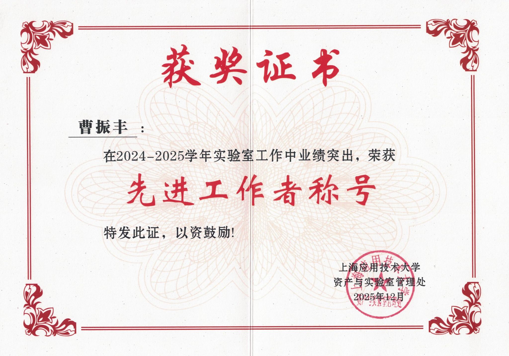 曹振丰具有近十年实验室工作经验,负责多个科研实验室的日常管理与设备维护,保障了实验室安全与设备完好。同时承担重要实验教学任务,并持续参与专业培训,提升业务能力。